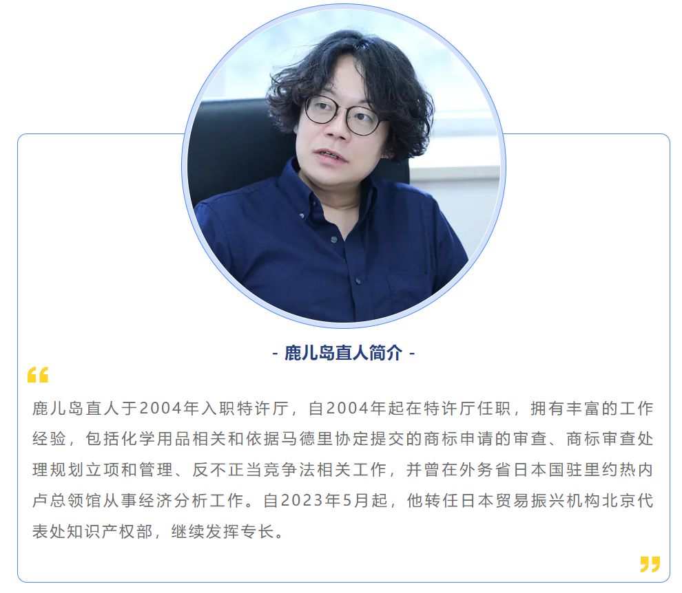 本次分享会上,鹿儿岛直人先生从中日商标法的审查流程、主要差异等方面进行了深入对比,详细阐述了不使用撤销审查、日本商标近似判断标准、许可备案制度以及日本商标侵权与维权策略等内容。他对中日商标制度与文化进行了比较分析,并重点介绍了日本申请第35类的趋势和实务操作。通过介绍中国企业在日本成功维权的案例,他的分享为中国企业在日本商标注册和维权提供了重要参考。